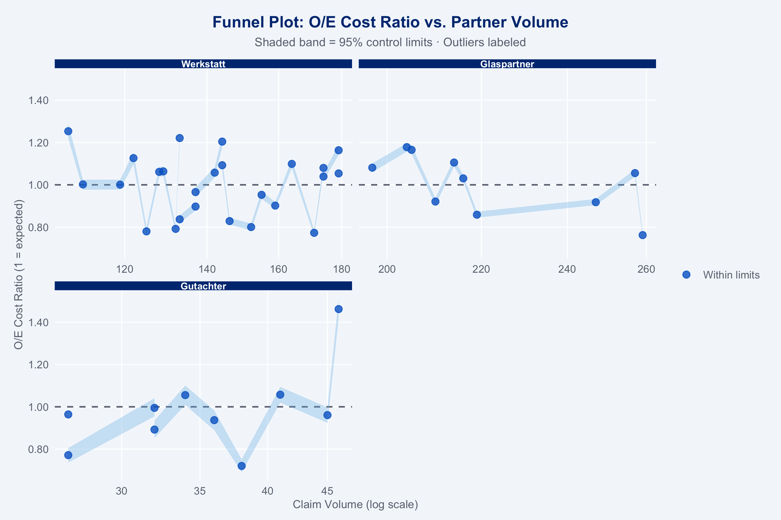title = "Funnel Plot: O/E Cost Ratio vs. Partner Volume"