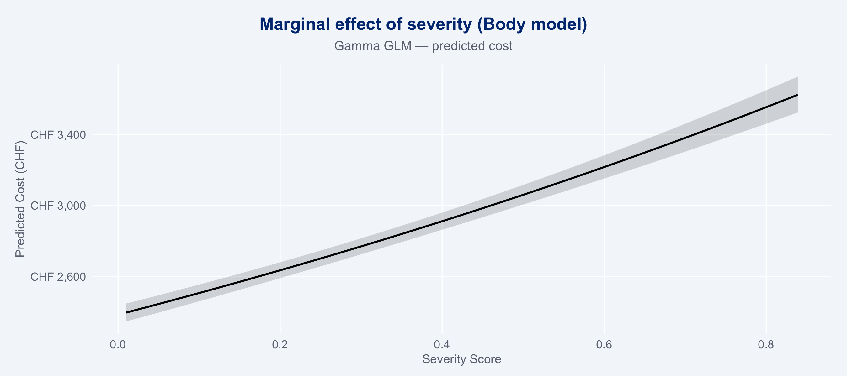x = "Severity Score", y = "Predicted Cost (CHF)") +