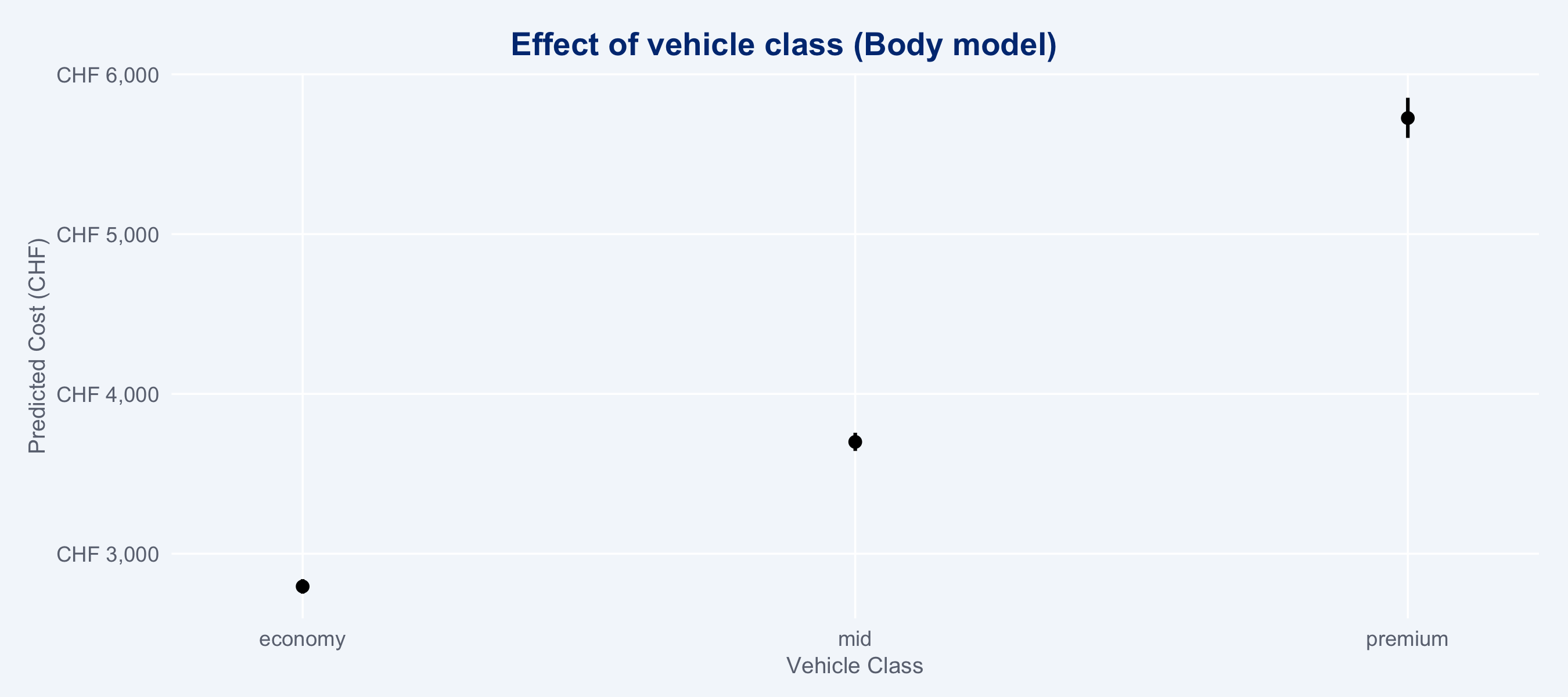 x = "Vehicle Class", y = "Predicted Cost (CHF)") +