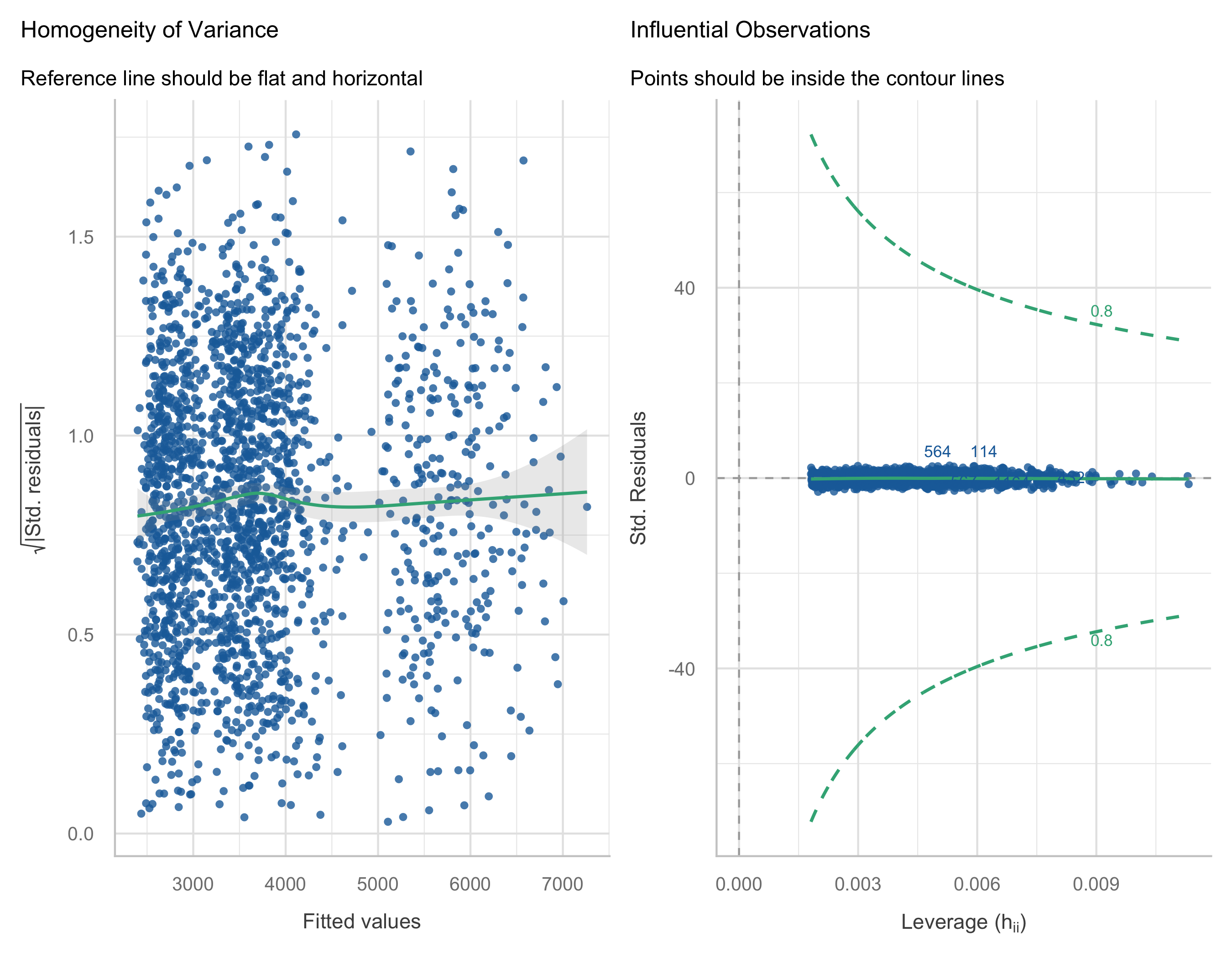 check_model(m_body, check = c("qq", "outliers", "homogeneity", "linearity"))