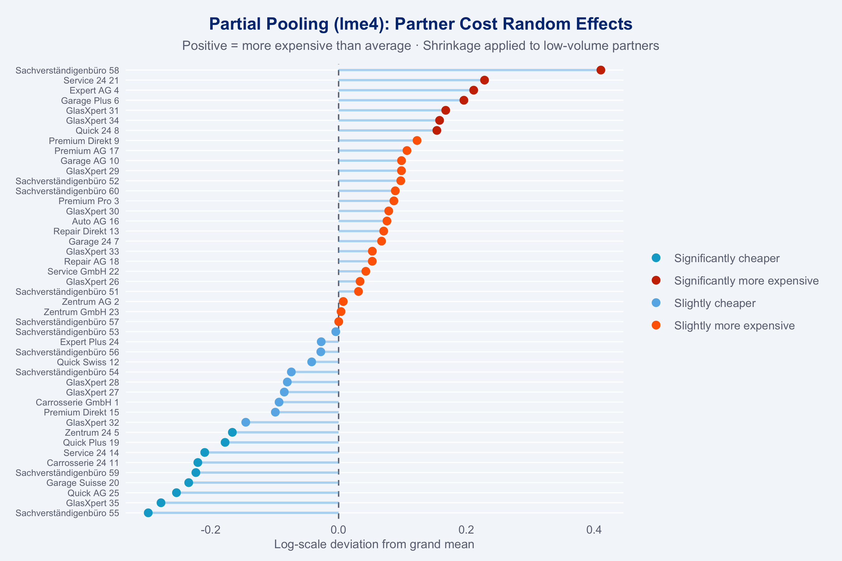 subtitle = "Positive = more expensive than average · Shrinkage applied to low-volume partners",